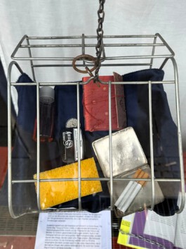 Mailin Alders, Carrier Bag of Coal: Erinnerungen tragen. Installation mit Kauenkorb und diversen Objekten. Foto: Luca Waterman.